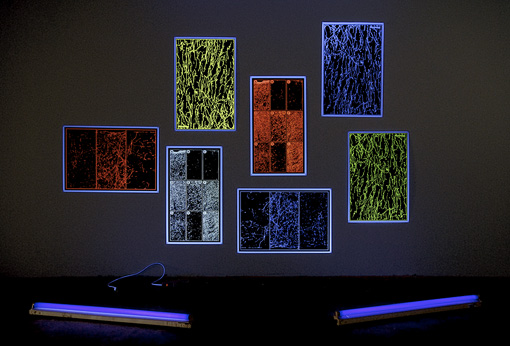 Jeremy Shaw, Representative Measurements, 2008, Black light silkscreen posters with UV lights, dimensions variable